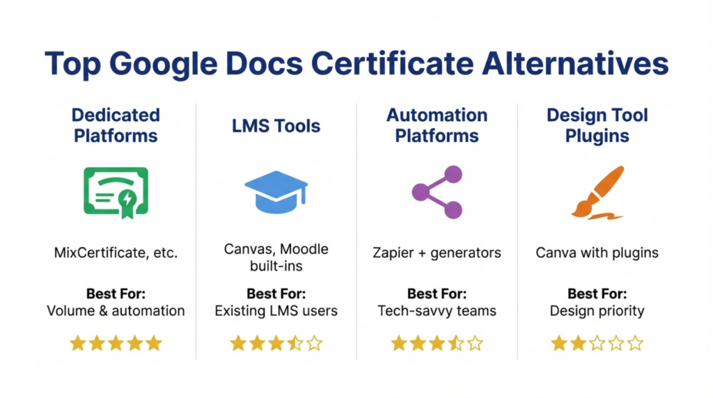 Several platform categories offer automated Google Docs certificate alternatives, each serving different use cases and technical requirements. When evaluating Google Docs certificate alternatives, organizations should consider their specific volume requirements and technical capabilities.